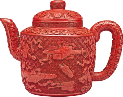 属清宫所藏乾隆紫砂胎雕漆茶壶,传世极少。