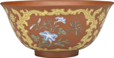 紫砂胎质略粗。碗底书“康熙御制”。此碗壁上绘有同色釉彩的三种不同花卉,在康熙珐琅彩茶器中亦为罕见。
