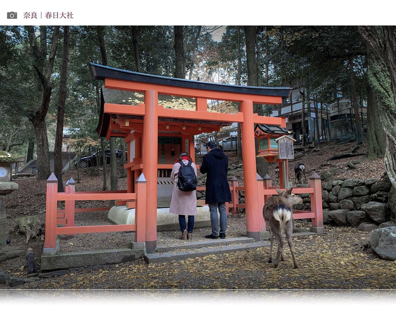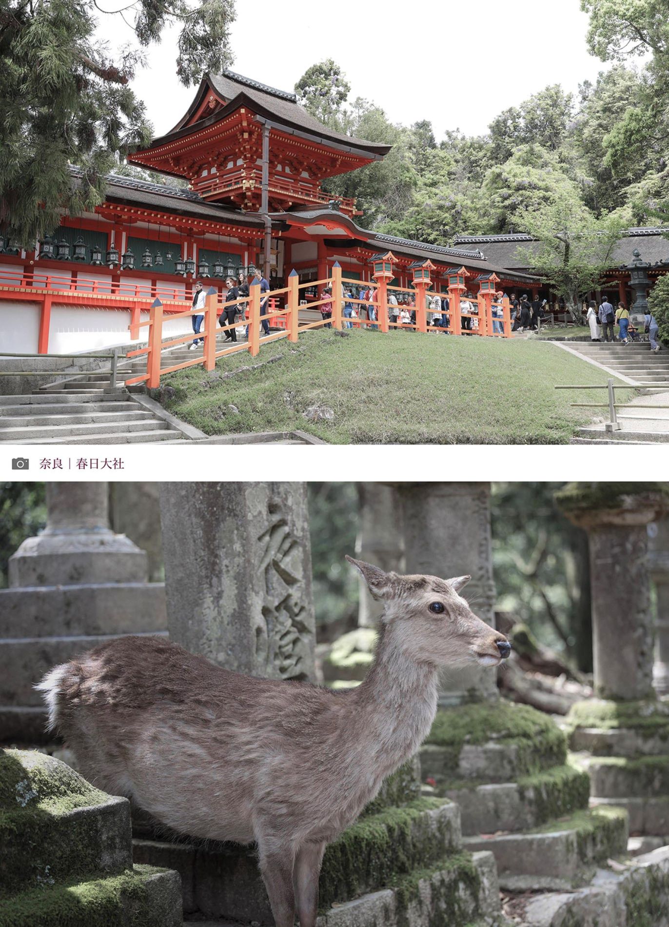 藤原不比等,不仅仅中兴佛教迁移了兴福寺,而且还为藤原家族的守护神建造了春日神社。藤原氏一门的守护神是武瓮槌命和经津主神,祖神是天儿屋命和比卖神。传说武翁槌命乘鹿而来,于是鹿也成为了神的使者。从此,奈良的小鹿驰名天下。穿过奈良公园,一路前往春日大社。道路两旁几乎就可以感受到春日山原始森林的痕迹了,作为神山的春日山在千年历史中被禁止砍伐,即便是公园内也可以看见参天古木。在一盏盏石灯中间蹦跳着等待游人的小鹿,此时若是手持鹿饼,小鹿便不请自来。这就是神派来的使者吧!只是越靠近奈良公园,早已吃饱了的小鹿不屑于游人手里的鹿饼;越靠近春日大社,那些小鹿才会为了口粮而鞠躬折腰。