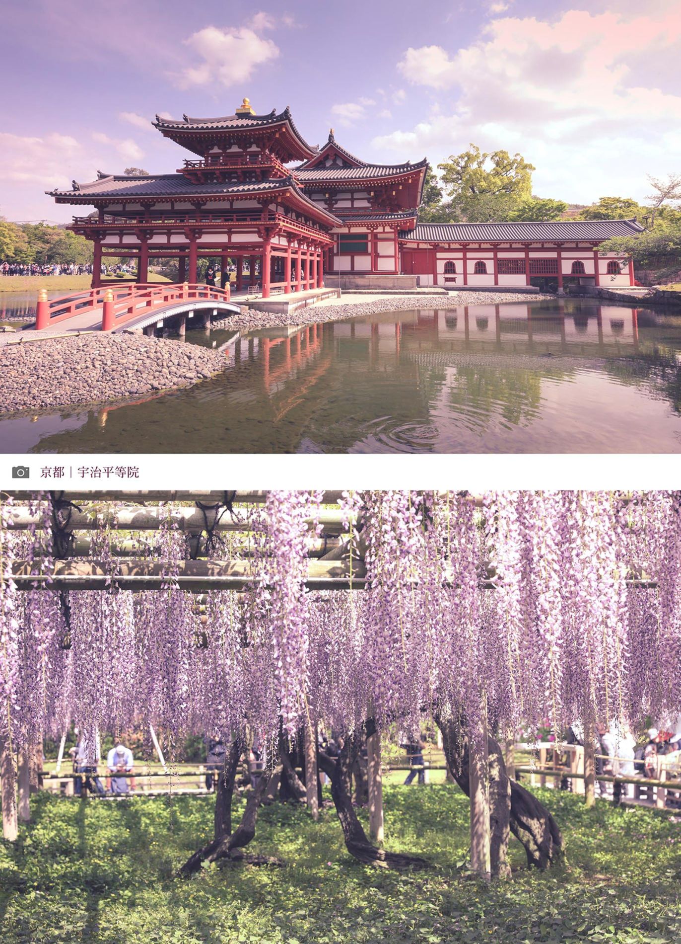 堂门面向东方,可迎接每日第一缕曙光;而到了夕阳斜下,余晖射向弯起的屋檐和腾飞的凤凰,堂前的水池中又将熠熠生辉的阿弥陀堂倒映出来,这一幅闪耀着神圣气息的画面美好而迷人。临近五月,院内的紫藤花开始绽放。绿色的叶,紫色的花海,相衬着赤红色的凤凰堂,就像佛祖拿着调色盘绘出的现世极乐净土。