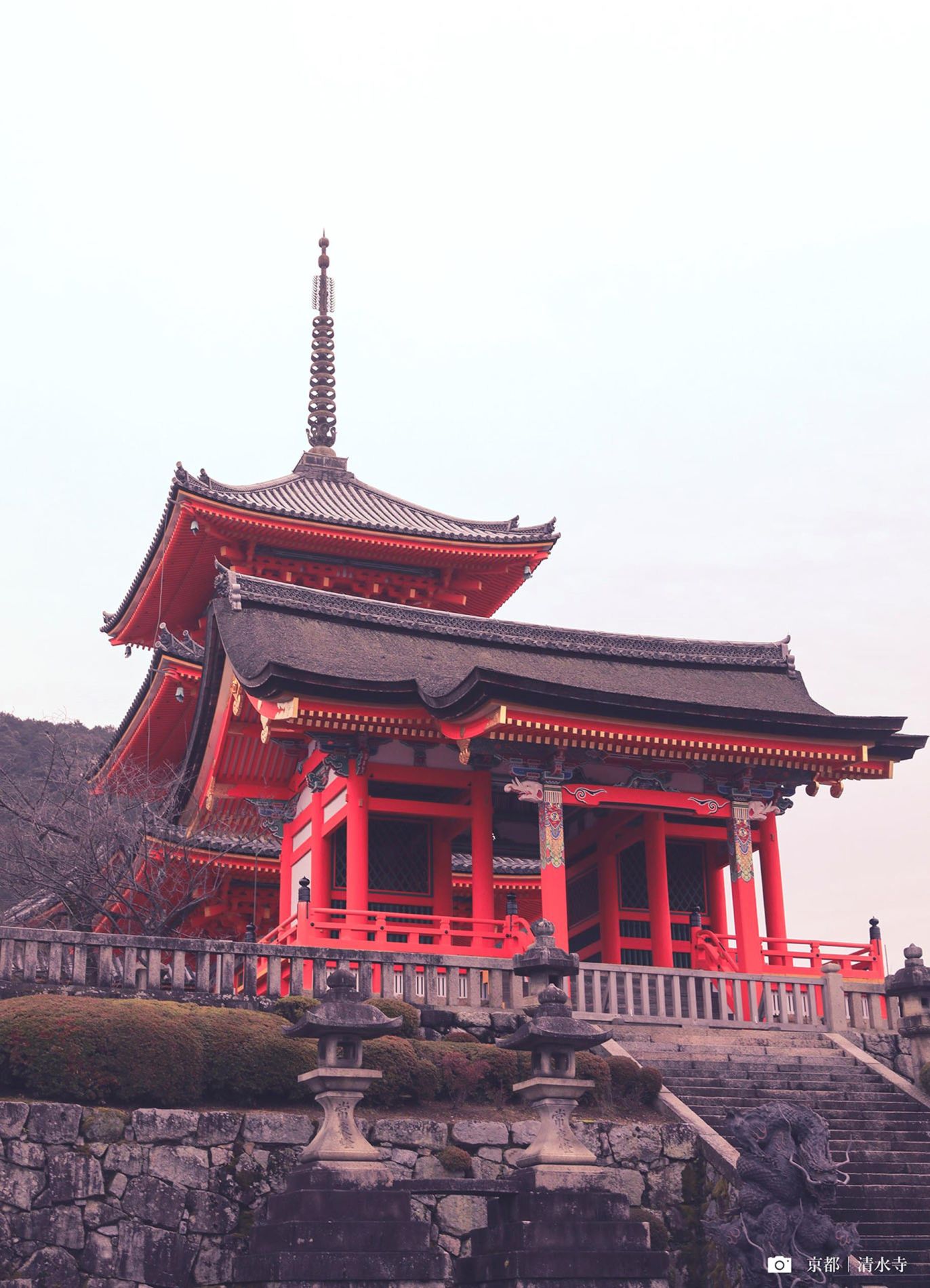 与东寺相比,另一处更古老的寺院却经历了十次焚毁与重建,那就是始建于公元778年的清水寺。在京都的众多寺院当中,恐怕清水寺是最为闻名的了,一年四季虔诚的朝拜者络绎不绝。清水寺,取名于音羽山深处灵动涌出的泉水。根据「续群书类丛」的记载:苦行僧贤心在奈良修行时,梦中一位白衣老翁告知“向北处求取清泉”,于是贤心遵梦北上,行至音羽山处见得涌出的清泉。观音化身的行壑居士出现,命贤心雕刻千手观音安置于此。