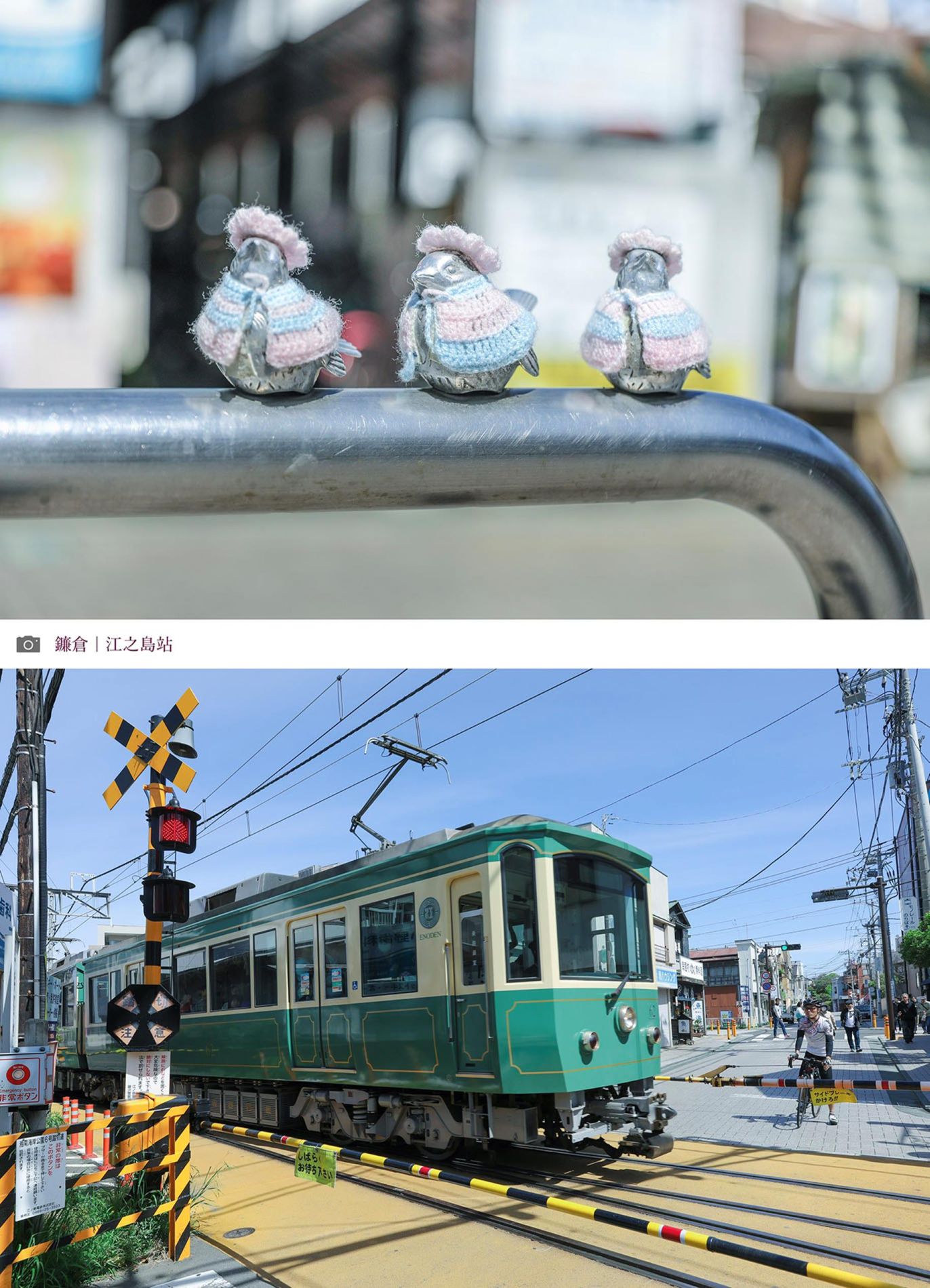 前往江之岛搭乘江之电便可,走出站台便能看到栏杆上穿着毛衣的小鸟。据说原本这些小鸟是裸露的,后来有一位老奶奶为它们织了毛衣。一年四季,随着春夏秋冬还会更换不同颜色的毛衣。随着那位老奶奶身体不适,接下来又有其他老奶奶接任继续给这些小鸟穿上毛衣,久而久之也就变成了这里一道靓丽的风景线。