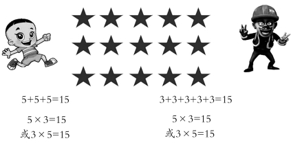 生:他俩说得都对。因为大头儿子是横着观察的,所以得到3个5相加。而光头强是竖着观察的,所以得到5个3相加。