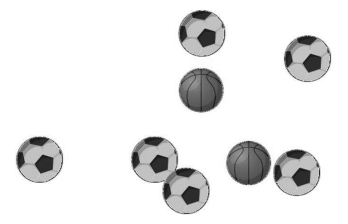 师:同学们好,这是一些足球和篮球的图片,老师把它们摆在了一起,谁能说一说你观察到了哪些数学信息?(课件出示图片)