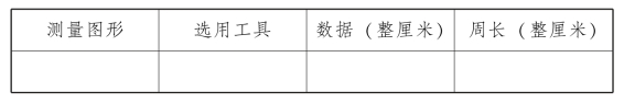 设计意图:引导学生运用已有的知识,选择合适的工具,测量不同图形的周长,逐步让学生形成度量的意识,在操作中进一步体会到“周长”的本质,体验测量方法的多样性,感受“化曲为直”的数学思想。