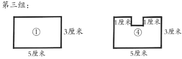 3组:④号图形的周长长,因为利用平移的方法,把④号图形变成一个长为5厘米、宽为3厘米的长方形后,还多出两条1厘米长的边。
