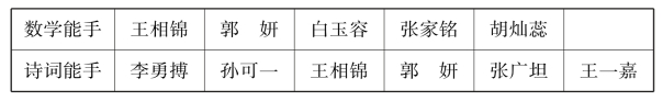 生:白玉容、张家铭和胡灿蕊只参加了“数学能手”比赛,所以他们的名字粘在左边;李勇搏、孙可一、王一嘉和张广坦只参加了“诗词能手”比赛,所以他们的名字粘在右边;王相锦和郭妍既参加了“数学能手”比赛又参加了“诗词能手”比赛,所以他们的名字粘在中间。