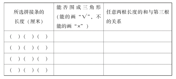 设计意图:这项实践性作业引导学生将“三角形边的关系”这一知识应用到生活中,激发学生的应用意识和探索精神,充分体现了“数学服务于生活”。