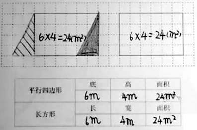 生:我发现平行四边形的底和长方形的长相等,都是6米,平行四边形的高和长方形的宽相等,都是4米,平行四边形的面积和长方形的面积相等,都是24平方米。