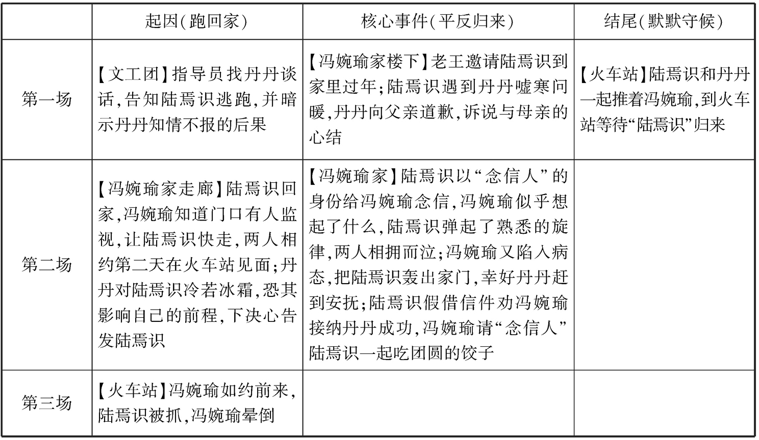 片段包含了影片中的三个时期,每个时期都有相对独立的事件,而三个时期的事件又存在着紧密的联系。影片中最主要的冲突是陆焉识的主观愿望与客观现实的冲突,平反归来却有家不能回是三个时期中冲突最为激烈、典型,也是最有利于人物开展积极行动的事件。因此,我们就以“平反归来”作为片段的核心事件,“试图唤醒妻子”是陆焉识在核心事件中主要的动作,这一诉求也是他与命运抗争最直接的体现,“跑回家”是“有家不能回”的前因,“默默守护”是陆焉识与“有家不能回”这一客观现实抗争后选择的归宿。这样的叙事结构不仅逻辑严谨、表述清晰,还明确了排演中的主次关系。核心事件中的重点场面要不惜笔墨重点渲染,而非核心事件需惜墨如金,有些交代性的过场戏点到为止,这样才能相得益彰,产生良好的戏剧效果。