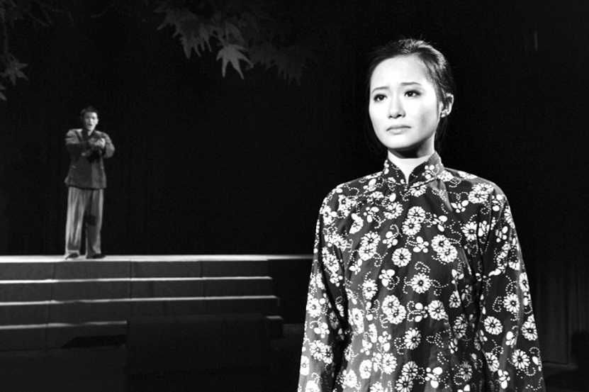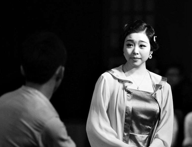 话剧《莲花》共分五幕,采用的是倒叙的方式。开篇就是“莲花劝天和回家未果,两个人都倒在了枪口之下”,而后的几幕依次是“莲花找生子要枪”“天和变心”“卖东西不成”,把整个事件的起因“莲花心疼天和决定拿出宝贝卖了,让天和过上好日子”放在了最后一幕,使全剧定格在两个为生存挣扎的小夫妻互相推让着一个烤白薯,唱着小曲,畅想着未来好日子的美好景象中。这样的叙事手法不仅引发观众“如果当初……”的假想与唏嘘,也使得最后一幕成为全剧最动人心弦的一笔,形成了浓郁的悲情氛围。戏中喜珠子劝天和的时候说过这么一句话:“有钱能使鬼推磨,有了钱也能使磨推鬼。”剧作家借着人物道出了作品主题——被欲望裹挟没有尽头。因此,在片段改编中,我们就以“天和变心”为中心事件,将最后一幕作为莲花的回忆出现,这样既完成了对作品主题的揭示,也保留了原剧叙事的艺术特色。