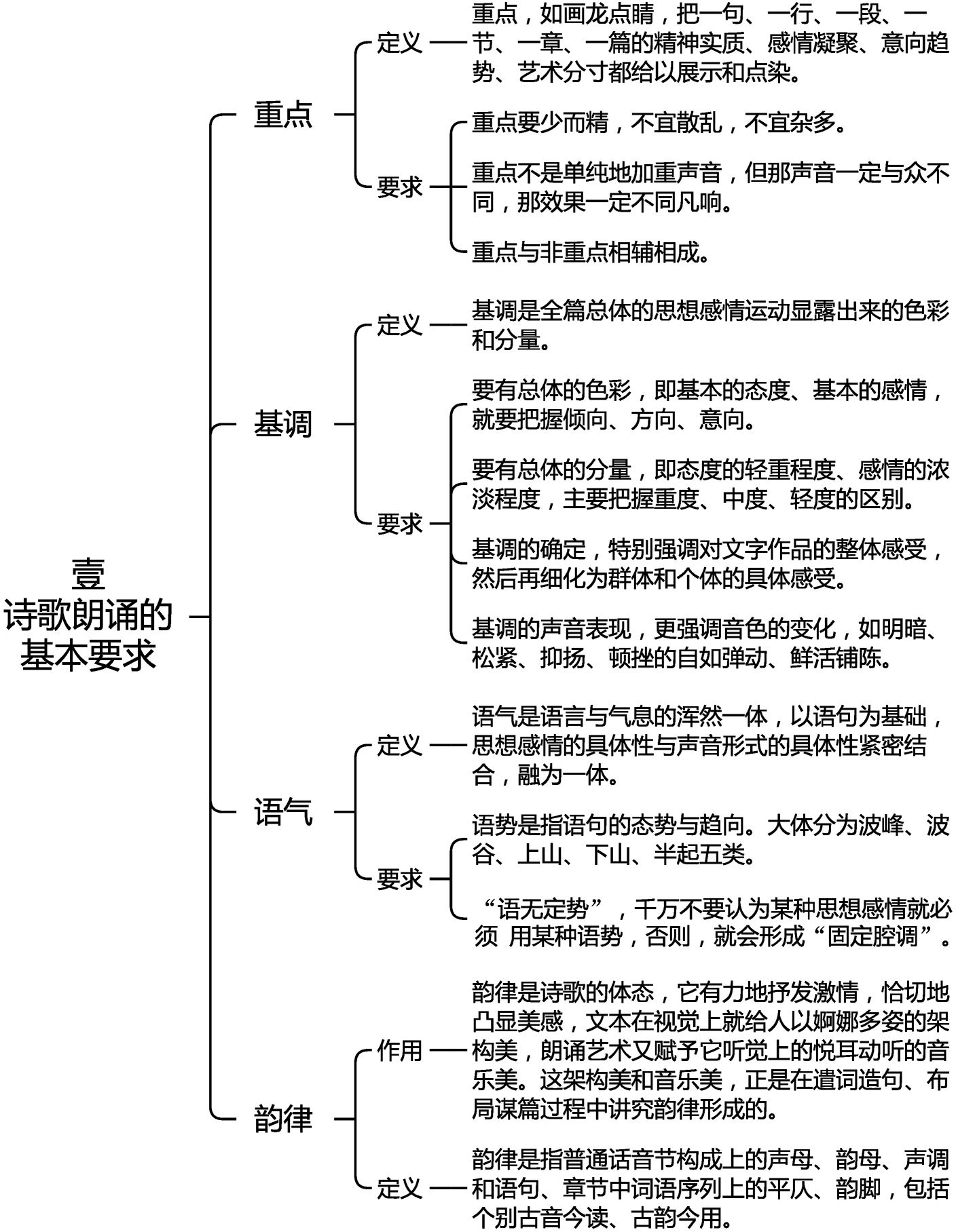 朗诵者在形之于声时,还要从文本出发,熟练地体味每个诗句的语气、每首诗的韵律。应该说,重点、基调、语气、韵律是朗诵诗歌的四大支柱,它们共同撑起了朗诵艺术的华美架构。