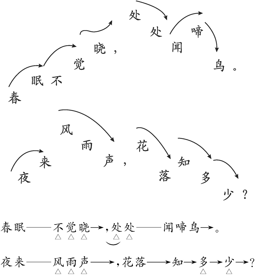“不觉晓”“处处”“风雨声”“多少”基本上突出了诗人的内心感受,轻快型节奏。最后一句,是深沉型渗入句,自问自答,不是疑问,应是感叹。