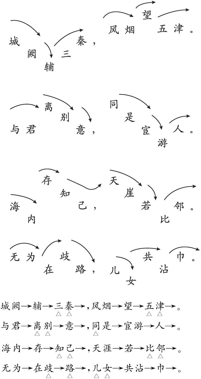 这首诗是王勃送一位姓杜的朋友从长安到四川去任县尉,一改过去送别诗的酸楚,表达了诗人昂扬奋发的豪迈之情,爽健清新,有积极进取的志向。本诗为舒缓型节奏,第三联为高亢型渗入句。
