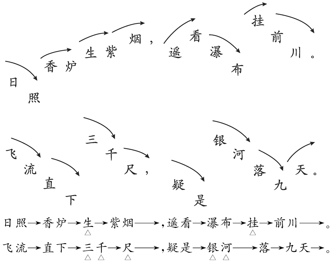 ③“飞流”要迅速下行,不可延宕。“直下”顺势下降。“三”字攀升,高行。“千”字稍降。“尺”字全上,托住,要有极高、极长的感受。