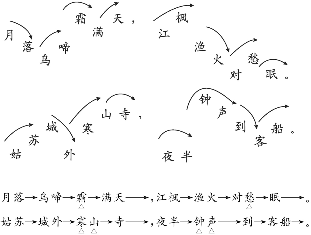 ④“夜半”低起下行,有夜已深的感受。“钟声”高起,“钟”字长,“声”字短,“钟”字强,“声”字稍弱,有敲击感。“到”字较长,下行,似钟声传到。“船”字稍起。