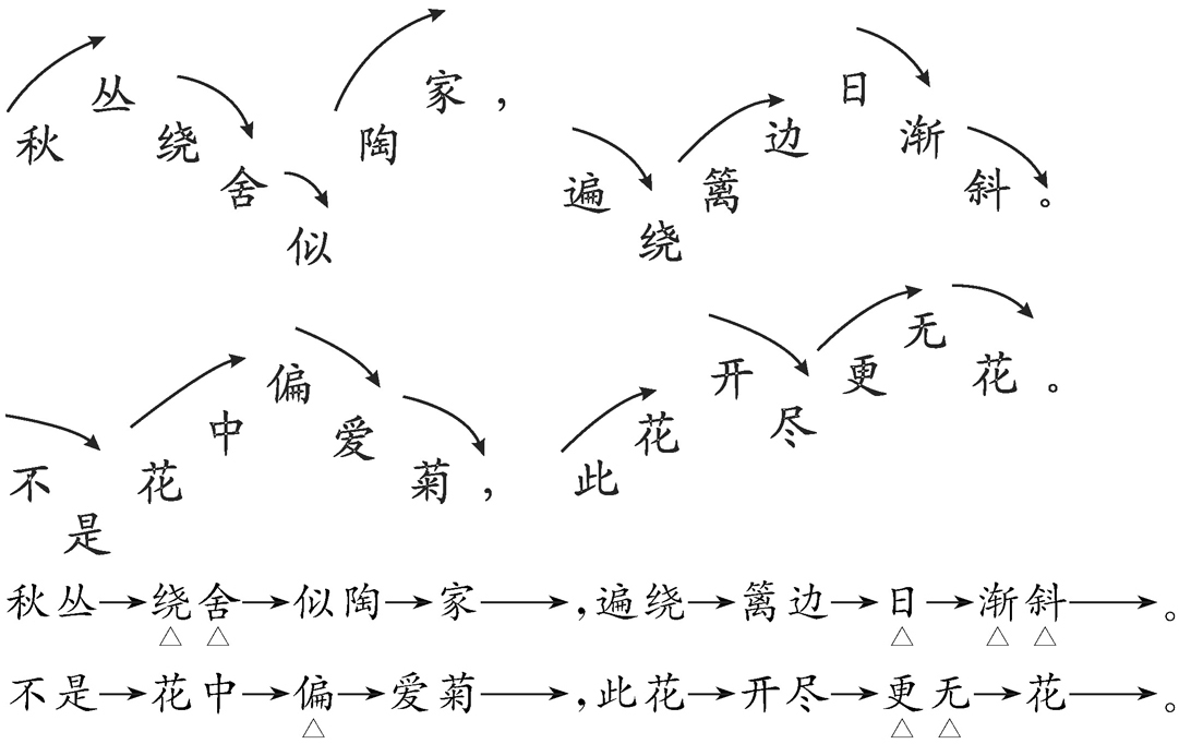 ①“秋丛绕舍”,由低到高再到低,环绕之意。“陶家”向往陶渊明宅,上扬。