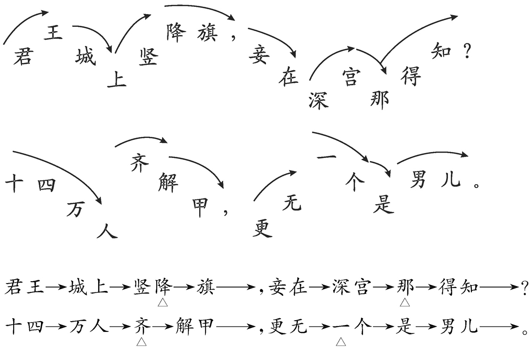 ④“一个”,与“十四万”对比,极言其无好汉。“一”字变阳平,高而长,“个”字下行,“是”字再下行,“男儿”稍重,平走。