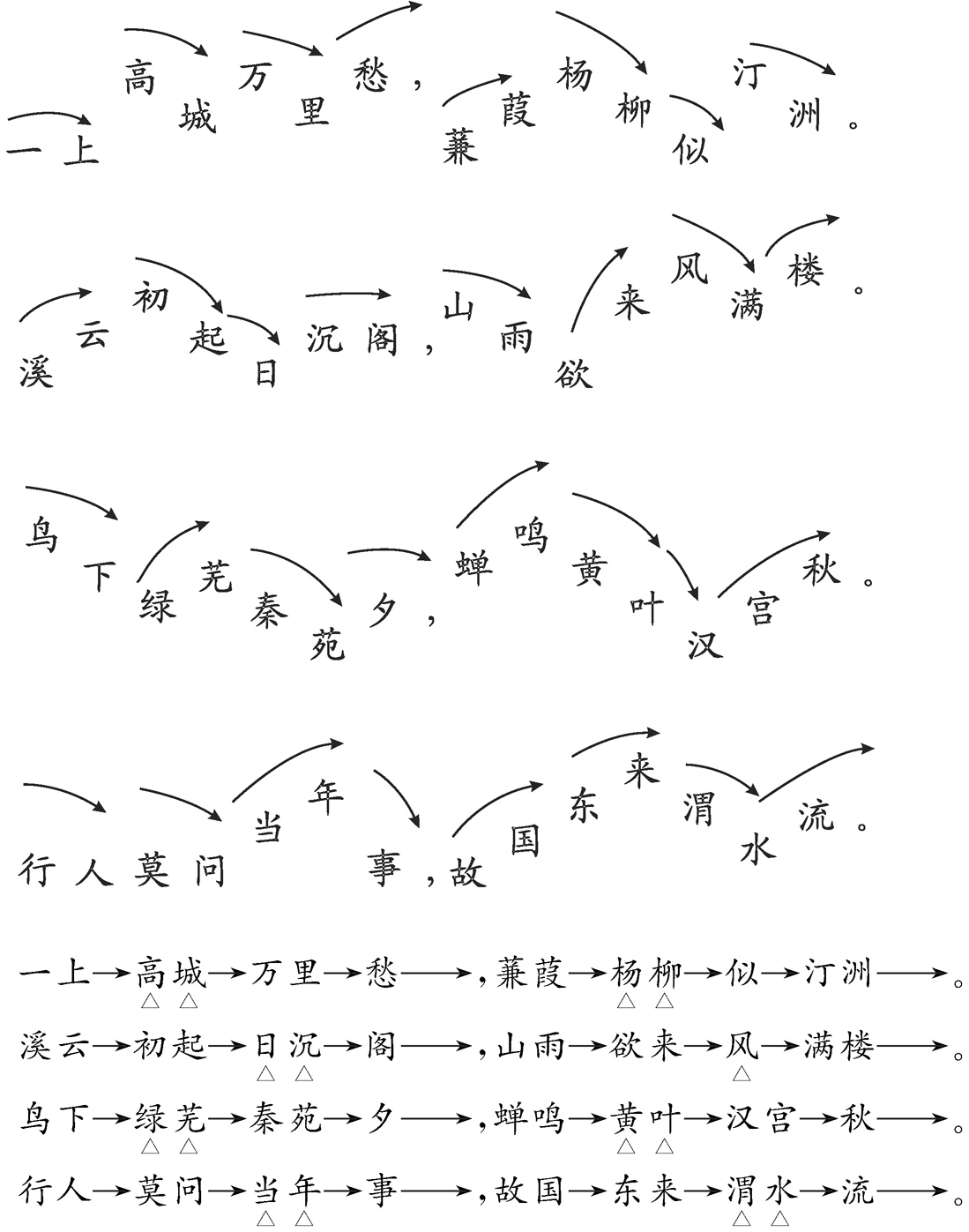 ④“山雨”自山上下来,由高起下行,“欲”低行,“来”扬,“风”再扬,“满”字下行,“楼”字上行。此句既写时景,又见哲理,不可随意为文。