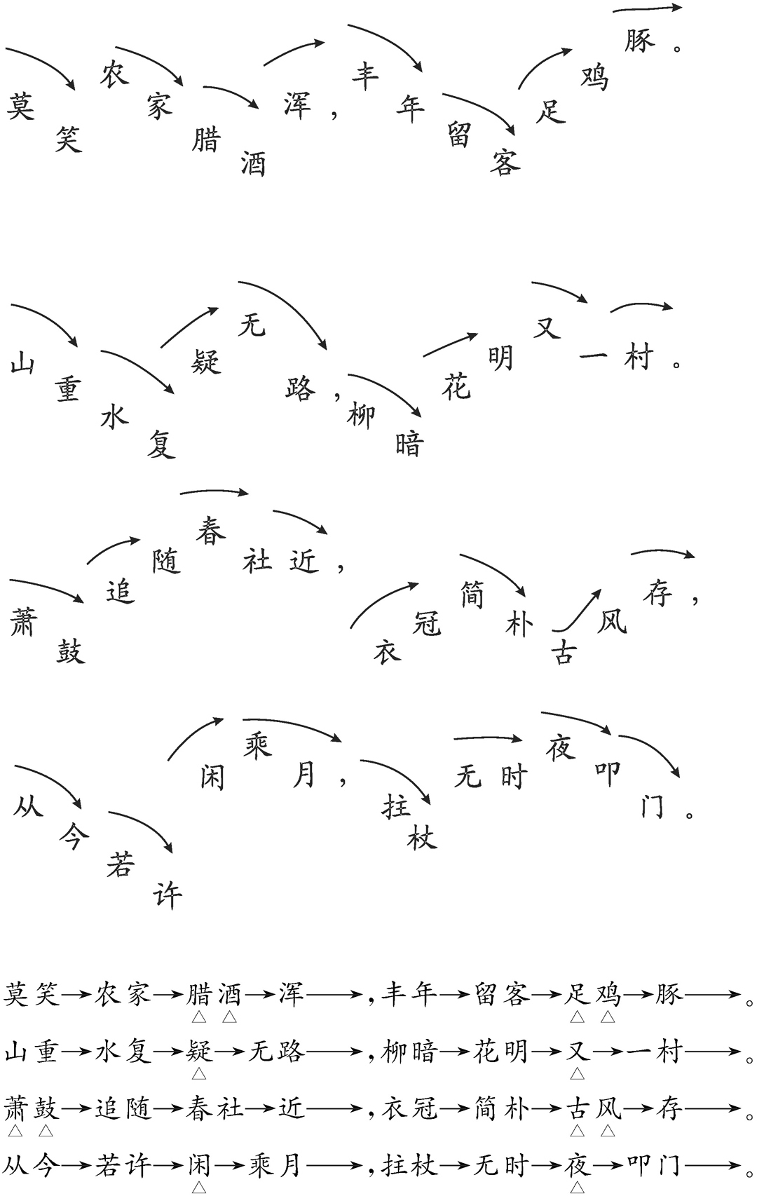 ②山水交织,花柳成行。“疑”上扬,“又”高起下行。内含哲理,千古绝唱。但此处不宜过分强调,舒展荡开,自能省人。