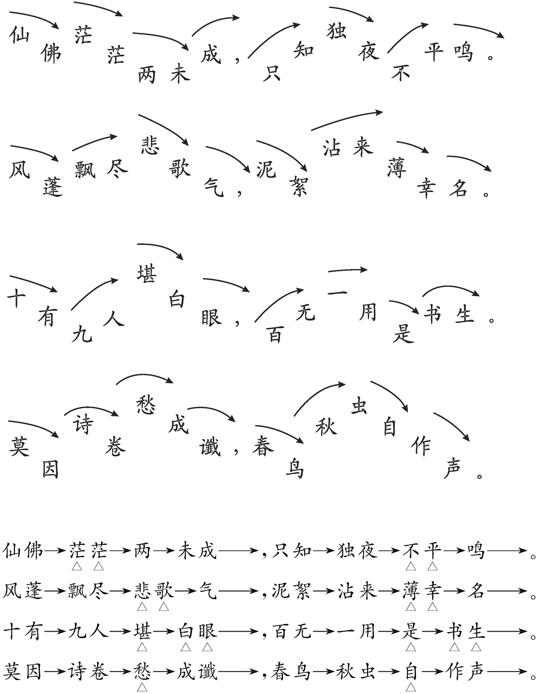 ④不要担心写诗会受到文字狱的迫害,那春鸟、秋虫都要唱出自己的歌声。“愁”高行上扬,稍重。“自”下行,坚定,稍长。“声”平收,稍重。