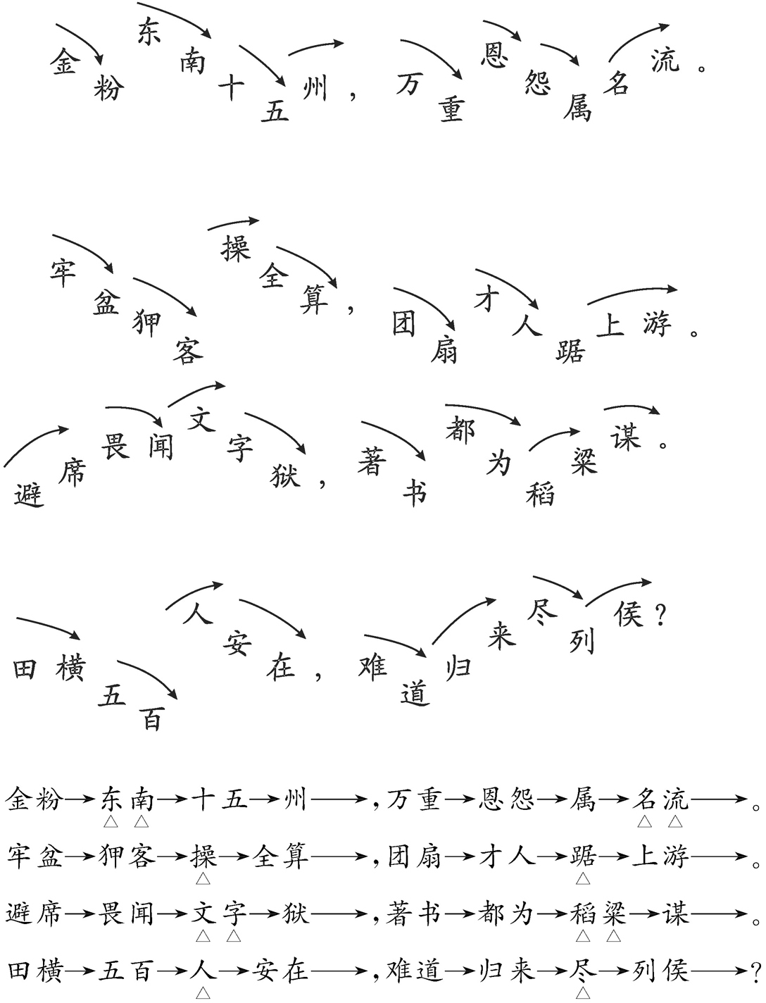 ③“文字”先扬再降,表示连文字都会惹祸入狱。“稻粱”低起上行,表示只顾觅求功名,一心往上爬。