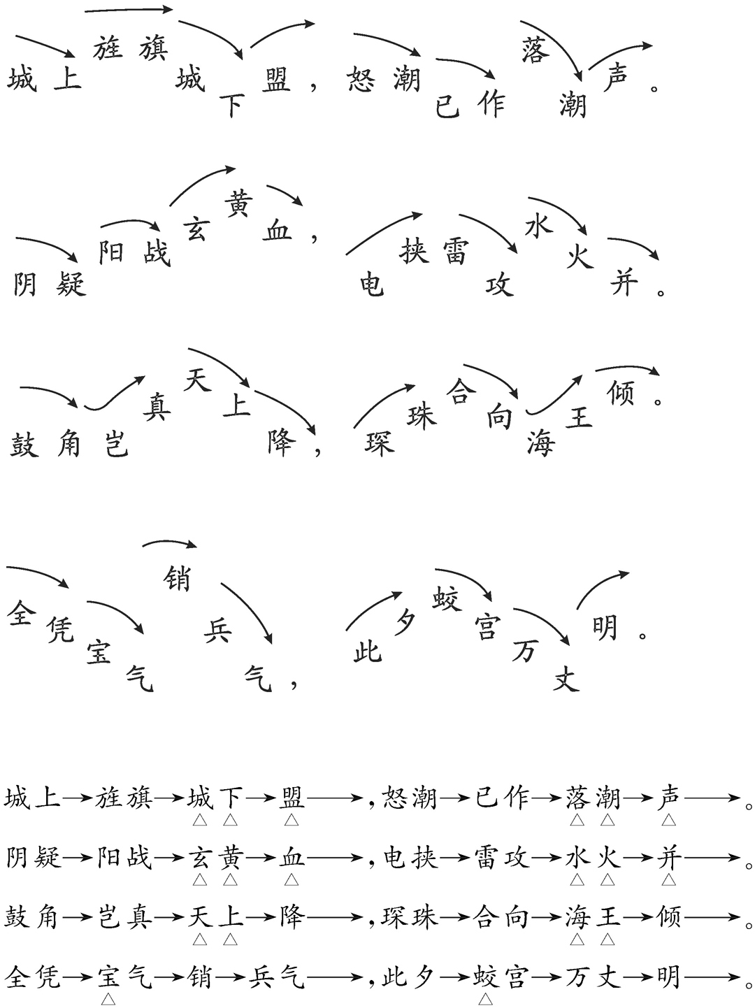 ②阴阳之战,血染大地。“玄黄”上行,“血”字下行,全上声。水陆炮火交织,如电闪雷鸣。“水”字近阳平,下接“火”,近去声,“并”字再抑。