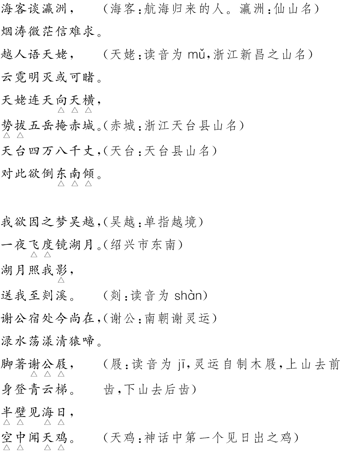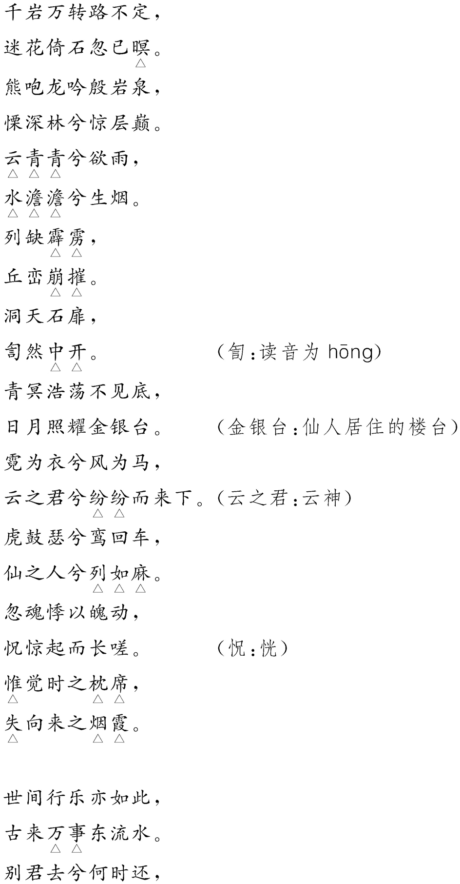 这首诗是以梦境为主的浪漫主义诗作,但洋溢其间的追求自由的精神,令人获得美感的同时,却又产生了人生的慨叹。大自然的奥妙与梦中仙境的美好,造成了同人世间趋炎附势的强烈对比。诗情昂扬畅达,语言浑然一体。朗诵时应突出这一特色,纵横驰骋,亦真亦幻,高歌轻吟,情随物转。应力避拘泥实在、语气迟滞。
