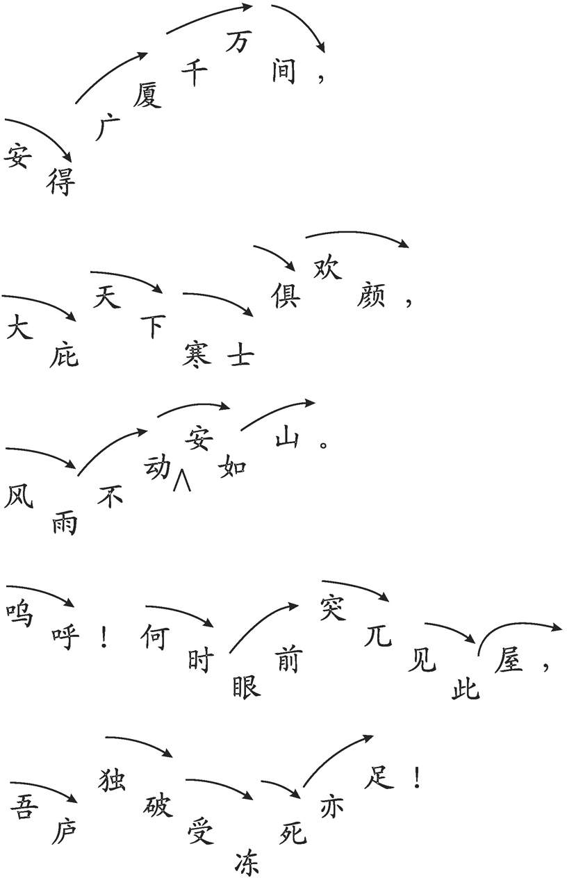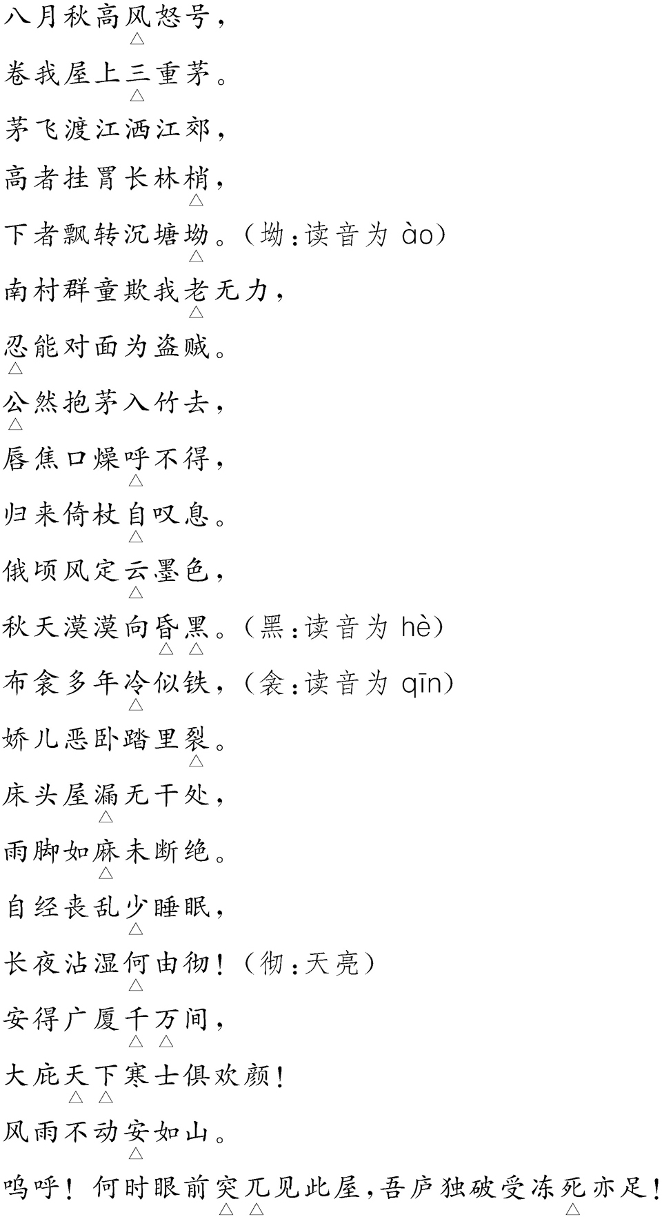这首诗是诗人的亲身经历,属于记事抒情诗。风雨飘摇、破屋烂被的生活,令人痛楚;而战乱奔波、人民苦难激发了诗人深沉的人道主义、舍己为人的高尚精神和美好愿望。全诗主要描绘了个人的悲惨遭遇,但从“安得广厦千万间”开始,升华为对“天下寒士”的关注,甚至个人死不足惜的无私胸襟。朗诵时,先要体会诗人年老体弱,面对茅飞童欺、焦急哀叹的心情,还要体会屋漏床湿、布衾破裂、难以成眠、切盼天明的悲伤与无奈。当然,最后的呐喊与渴望、祈求与理想,更要深入体味,要充满对诗人精神境界的赞美之意。但,不必声嘶力竭,不必张扬自我,只要发自肺腑、热诚真挚,就能较好地给以表现。
