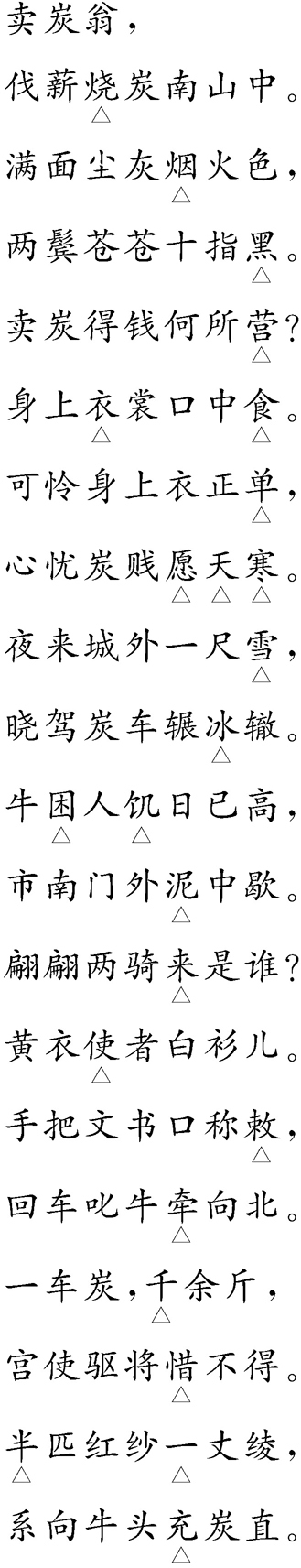 这首诗是白居易《新乐府》组诗中的第三十二首。唐朝中期,官宦横行,为了采购宫中的物品,常派大批人马到各市场上强抢货物,以低价购买甚至分文不给,硬把货物拉走,还要逼迫卖方加送钱财给这些掠夺者,这就是所谓“宫市”,老百姓苦不堪言。卖炭翁的遭遇就是一个例子。诗人对卖炭翁充满了同情,对宫市充满了痛恨。全诗语言晓畅,叙事清晰,内涵深刻。朗诵时,不应以好懂为由,以自然为美,像现代白话那样去“说”,而要更加强化诗中的真情和韵律,字字血,句句泪,控诉之声发人深省,哀告无门令人愤怒。