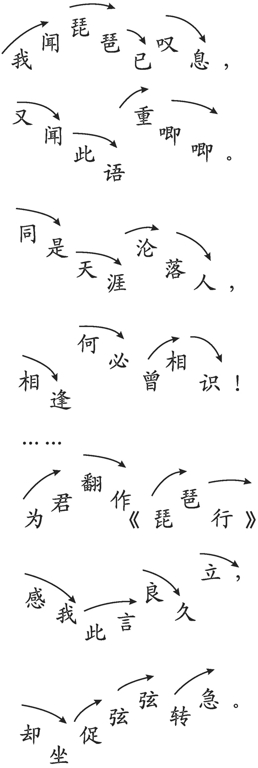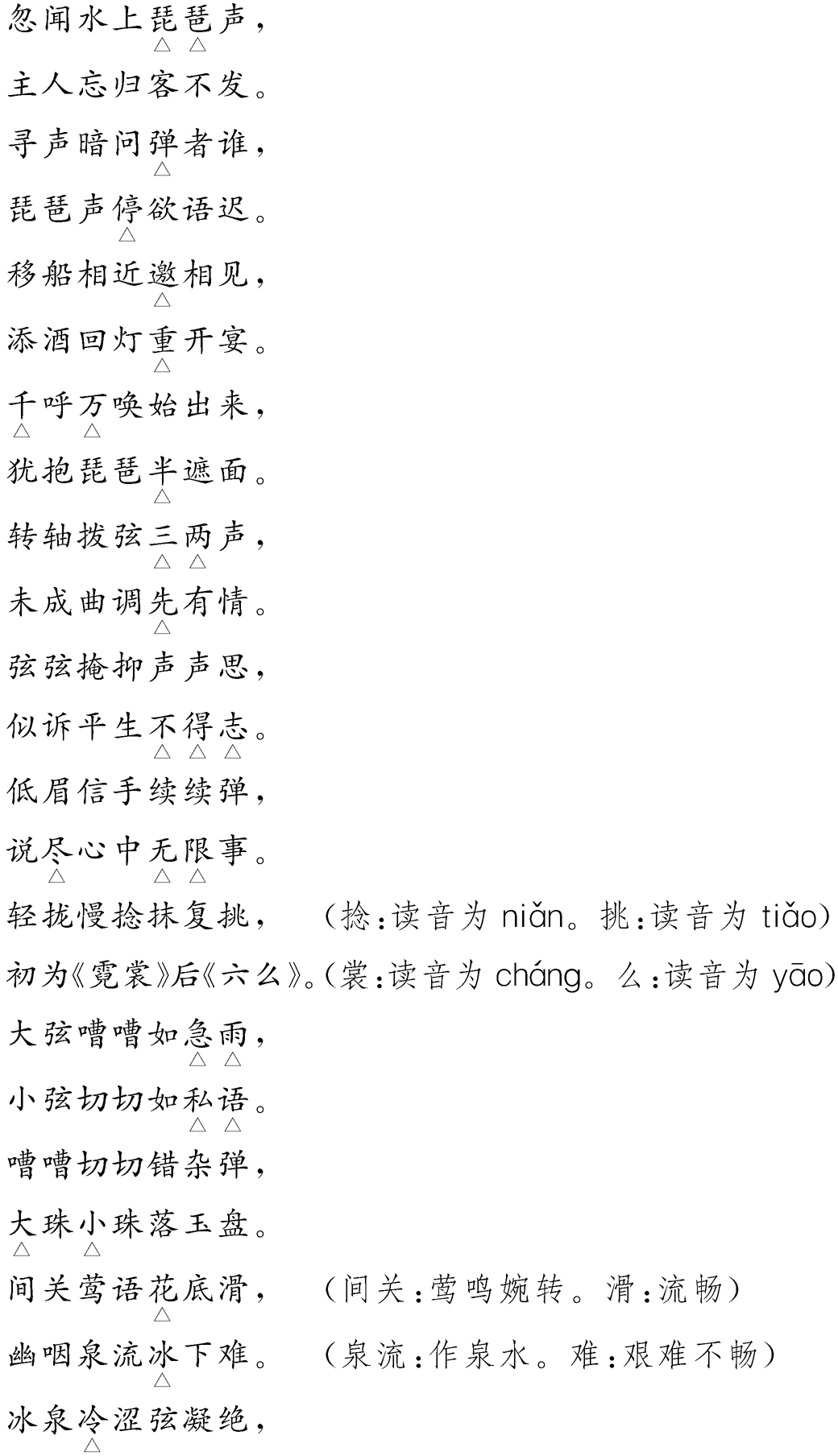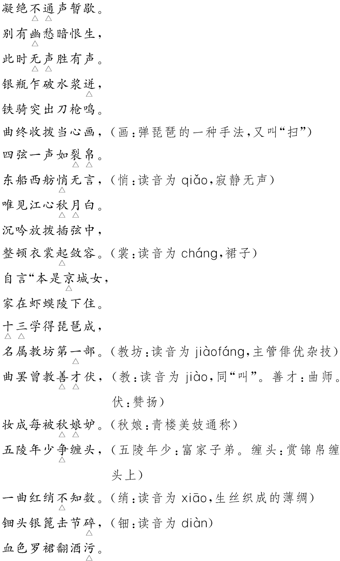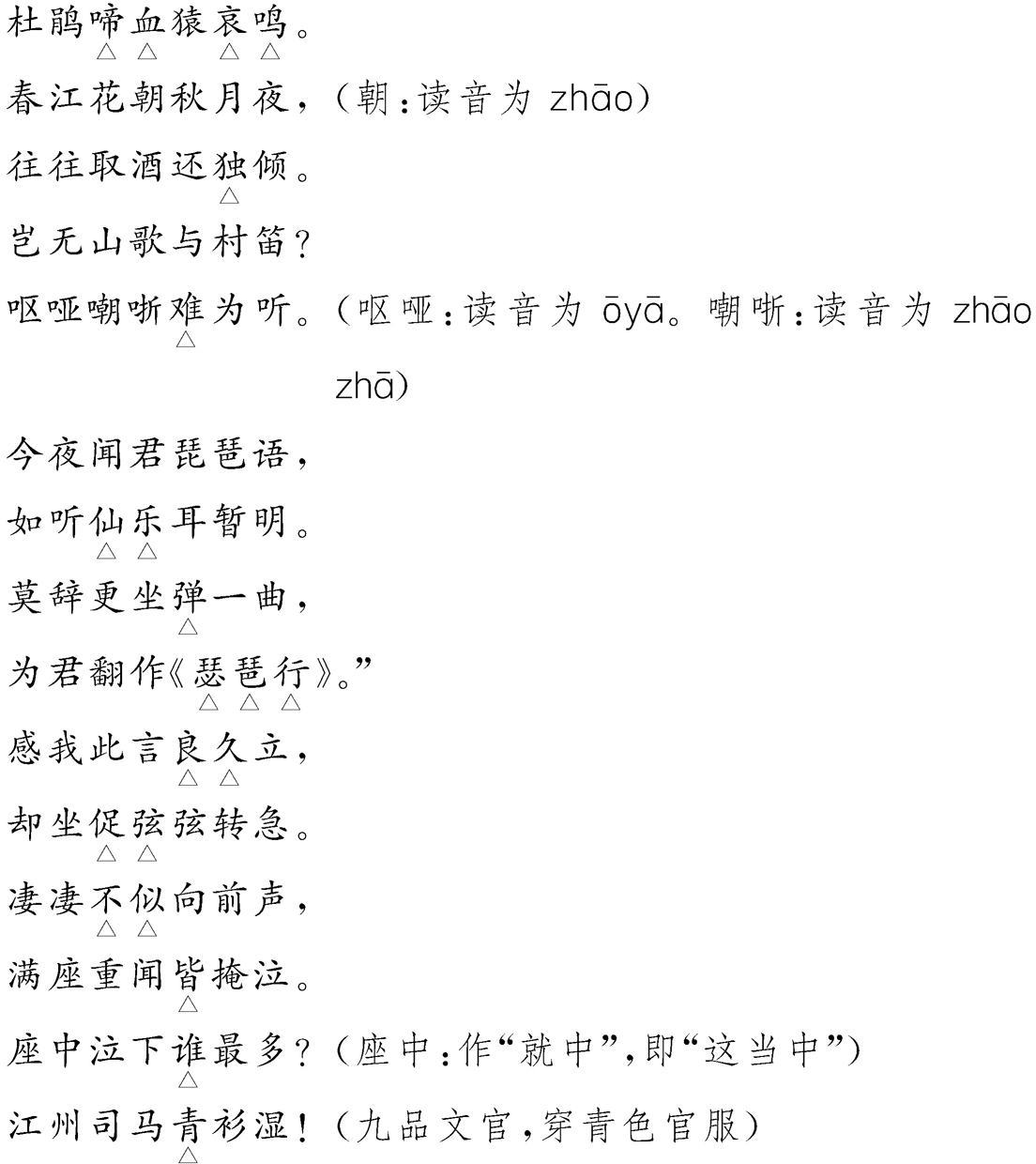 这首诗本题《琵琶引并序》,《序》中却写为《琵琶行》,“引”与“行”均是乐府歌辞的一体。为了更好地了解作者的创作意图,录其《序》供参考:“元和十年,予左迁江郡司马。明年秋,送客湓浦口。闻舟中夜弹琵琶者,听其音,铮铮然有京都声。问其人,本长安倡女。尝学琵琶于穆曹二善才,年长色衰,委身为贾人妇。遂命酒使快弹数曲,曲罢悯然。自叙少小时欢乐事,今漂沦憔悴,转徙于江湖间。予出宫二年,恬然自安,感斯人言,是夕始觉有迁谪意。因为长句,歌以赠之,凡六百一十六言,命曰《琵琶行》。”