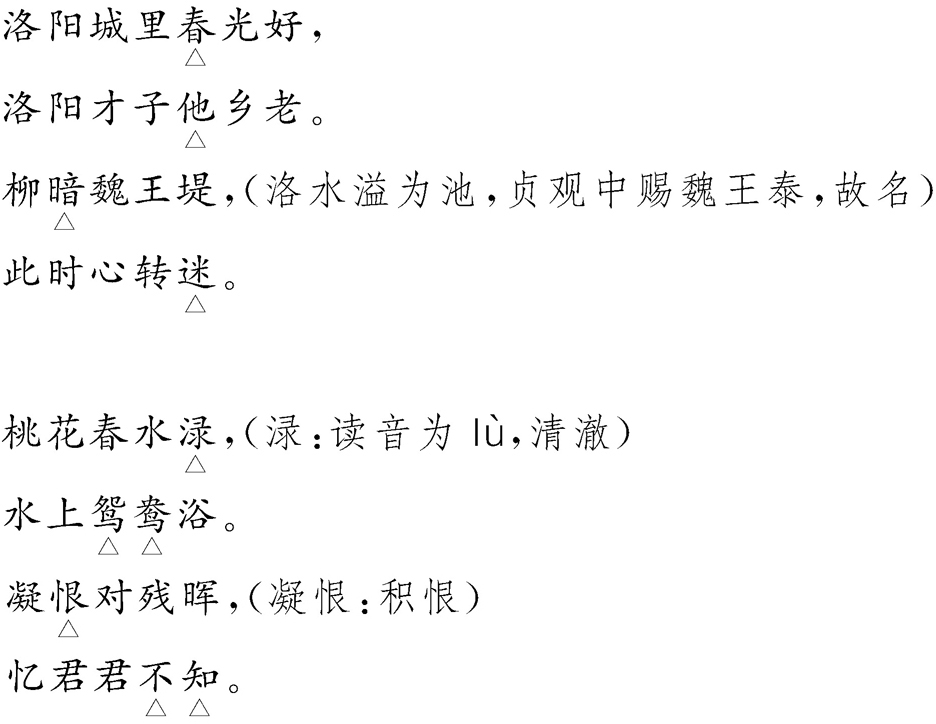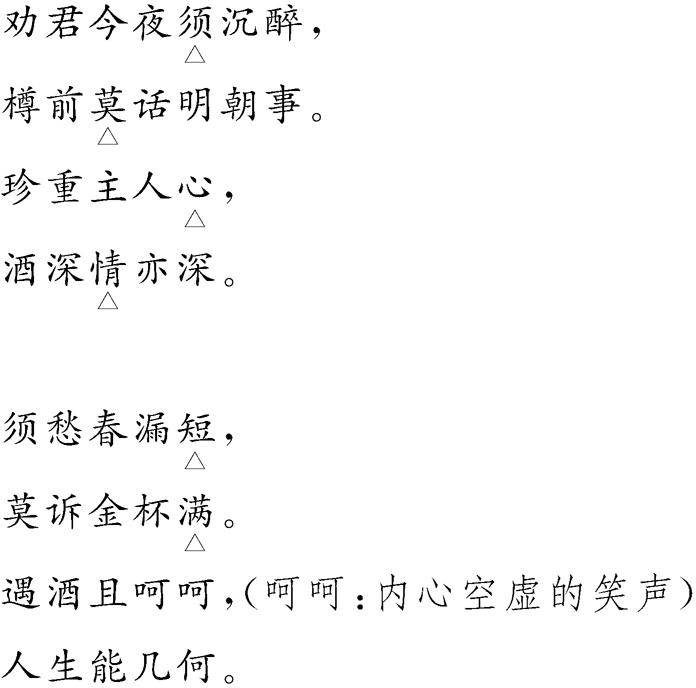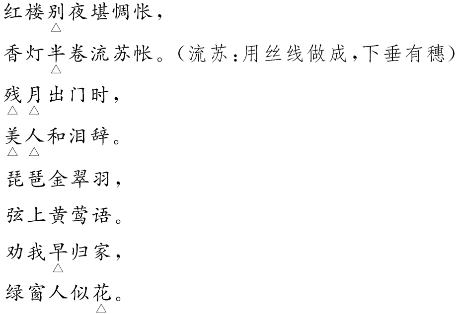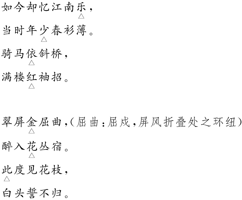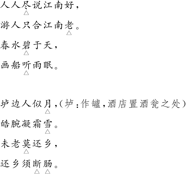 这五首《菩萨蛮》是韦庄多年流离江浙一带,晚年在蜀回忆旧游之作,极为深沉地表达了离乡之苦。人如转蓬,心事浩茫,越是不能回乡,回乡之心越重。朗诵时要把诗人那种“似直而纡,似达而郁”的委婉曲折、举一反三的笔触表现出来。五首一气呵成,各处转换变化全靠语气、抑扬、疏密给以显现。表层看似重在男女之情,实则用以寄托故国之思。这类词不必读出政治,但一定要突出诗人的情思。在这一点上,既有传承的脉络,又有个人风格,朗诵时不可不察。