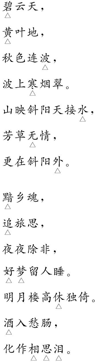 这首词以开阔的意境抒写了悠远的乡思,秋景秾丽,游子愁重,却不使人消沉沦落。有一句应注意,打破行间停顿,却不违韵律: