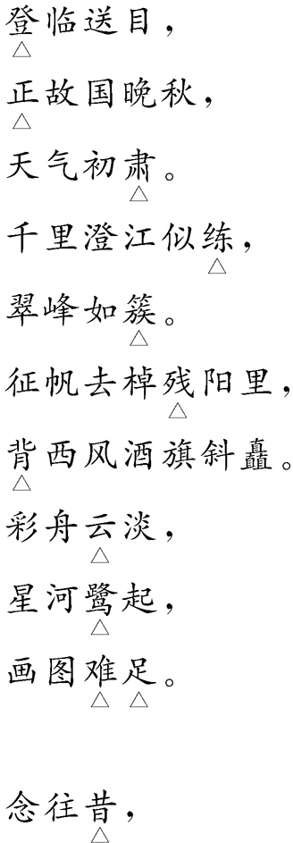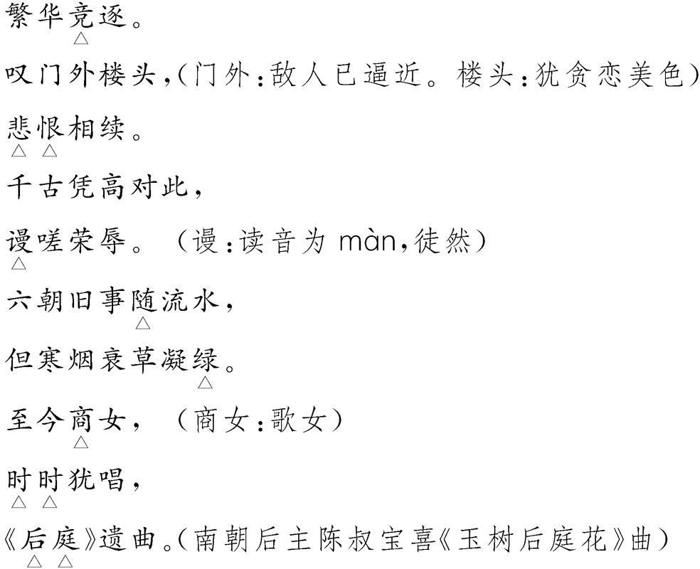 作者在南朝古都、金陵盛地,观秋景,叹兴亡,境界广远,感慨深沉。朗诵时,要高屋建瓴,大开大合。切忌低回缠绵,促急轻飘。