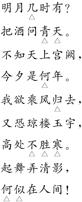 此词为中秋怀人的名篇,用语通俗,词意晓畅,想象飞腾,境界宏大。作者把“羽化登仙”的出世思想同“何似在人间”的入世理想结合起来,旷达豪爽,乐观情深。朗诵时必须控纵自如,洒脱自在,语境具体,词情通达。不要故作精深,拘泥声律。