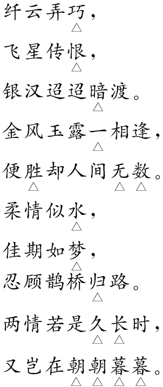 这首词专写“七夕”之事,着力表达两情诚笃,一相逢胜无数相会,不在于天天相处。既是神话,却不落俗套,离别之苦、思念之切,不过是“常理”,其真正意义还是“情”之长短。深刻的人生感悟,警示着多么丰富充实的理念。朗诵时,紧紧抓住对比的强烈,感情的浓烈,使这首词造成震撼心魄的魅力,竟可作山盟海誓的座右铭。