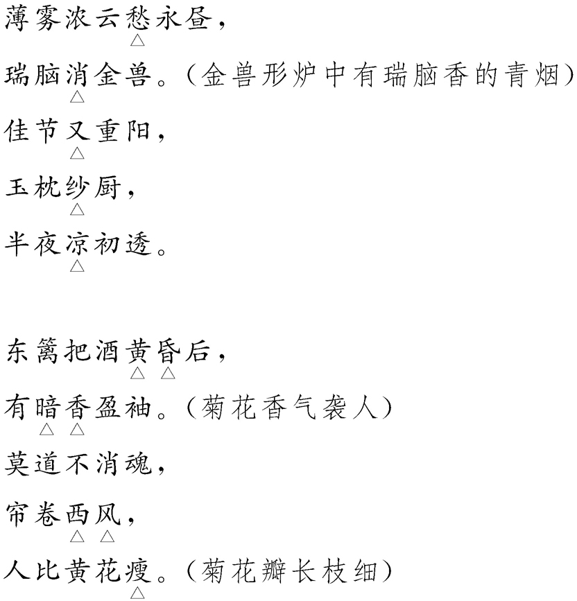 这首词是抒发作者在深秋的孤寂中思念丈夫的心情,用意独特,取词佳妙。朗诵时要把秋色、佳节、孤单、思绪融入词句中,扬起为辅,下抑为主。