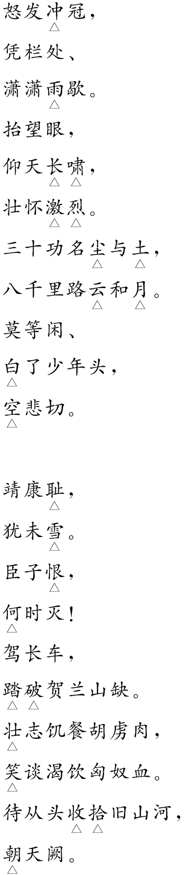 这首词是岳飞在南宋初建、身负重任的时候写成的。岳飞豪气凌云,壮志如山,报仇心切,复国血热。这首词表现了抗金将领的主战心声,表达了人民群众反抗外族入侵的强烈愿望。朗诵时要气壮山河,但不必声嘶力竭;蔑视敌人,但不讥笑鄙薄。“胡虏”“匈奴”均为修辞借代,而非指整个民族,不必以史解文,望文生义。