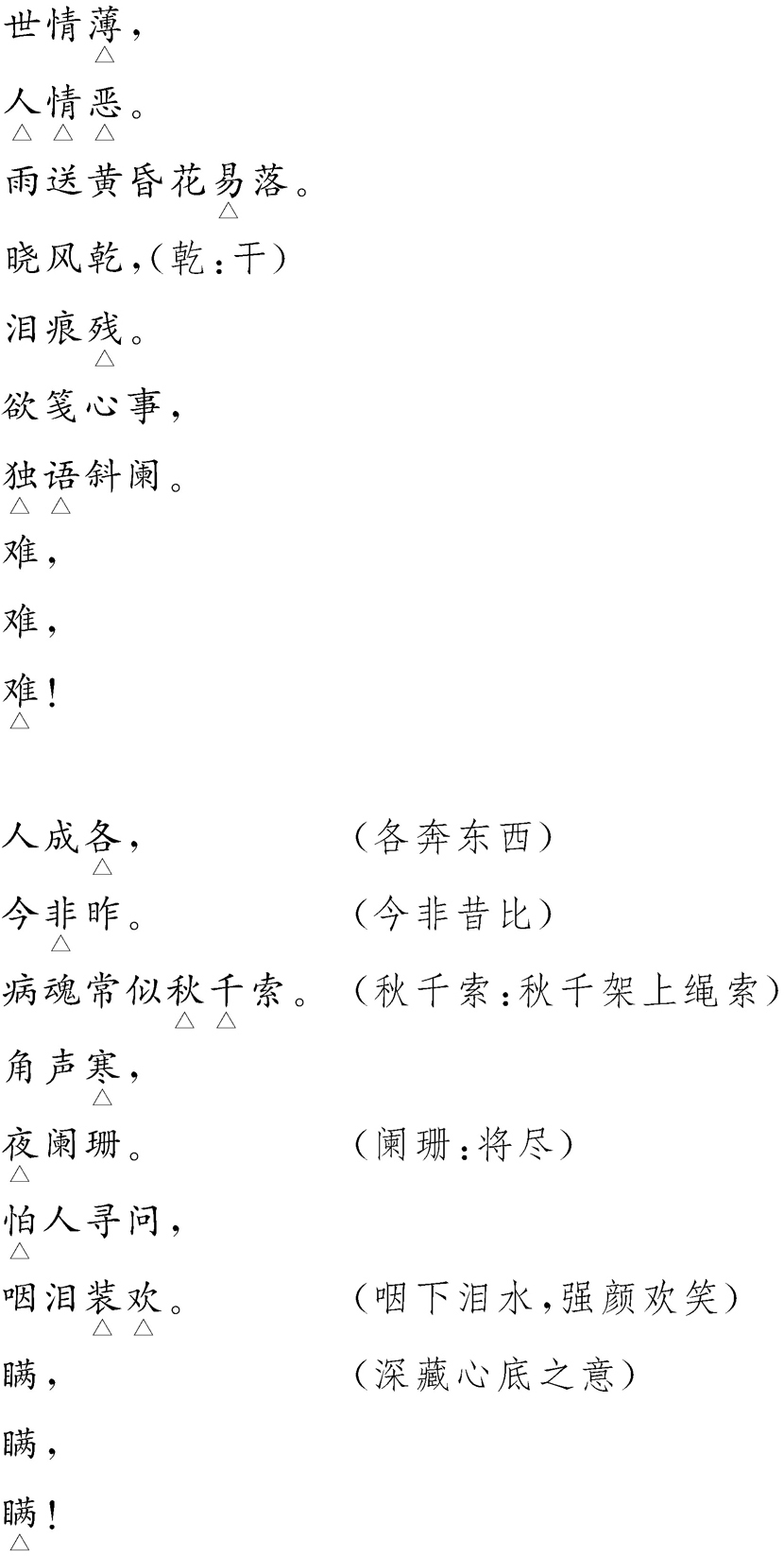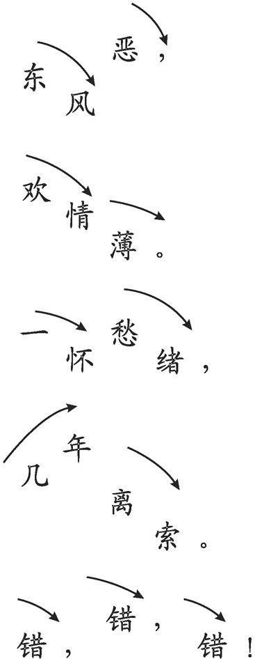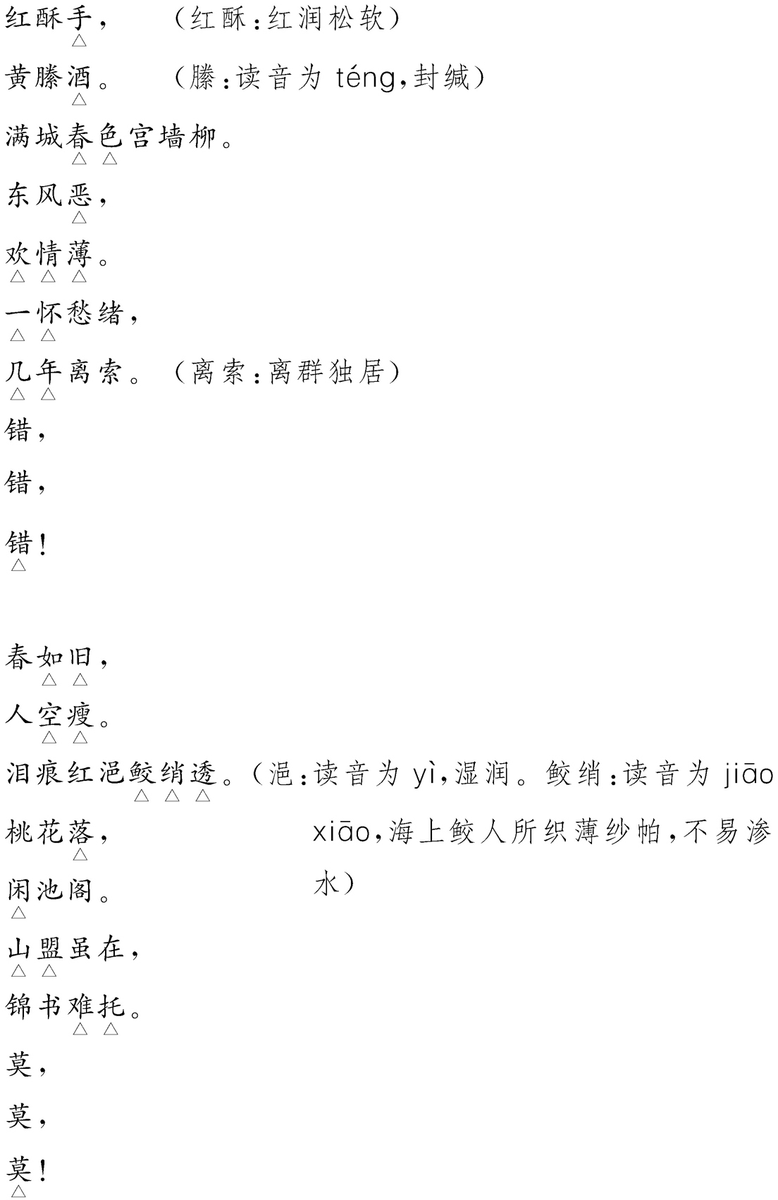 陆词凄怆酸楚,唐词缠绵执着,写尽人世炎凉、心态曲折的境遇和苦痛。朗诵时要细心把握二人的相似处和相异处,特别是陆词中的愧悔,唐词中的委屈,应给以人格美化的表现,以形成对封建礼教的控诉,不必一味只向对方倾诉,不可只是表现无奈。