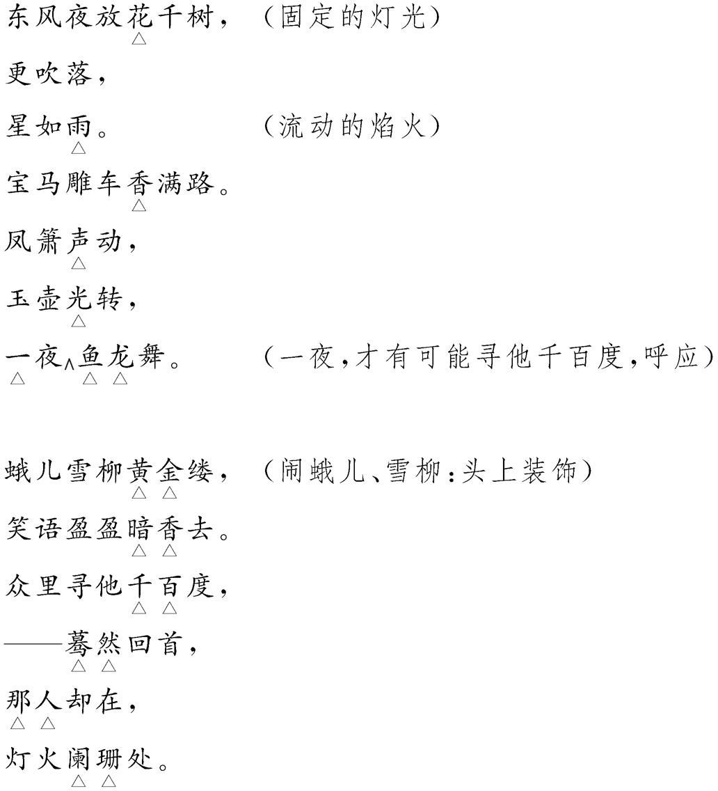 这首词表现了上元灯节热火朝天、人群熙攘的场面,更加突显了在灯火阑珊处的“他”,从而极其浓重地渲染了“寻他”的人情有独钟、痴心执着的强烈愿望与深切感情。朗诵时,一定要先描绘火树银花、鱼龙飞舞的情景,然后转入盈盈众女之姣好,一切均似不经意,再突出主题,坚定而惊喜。蓄势之法,由此可得。
