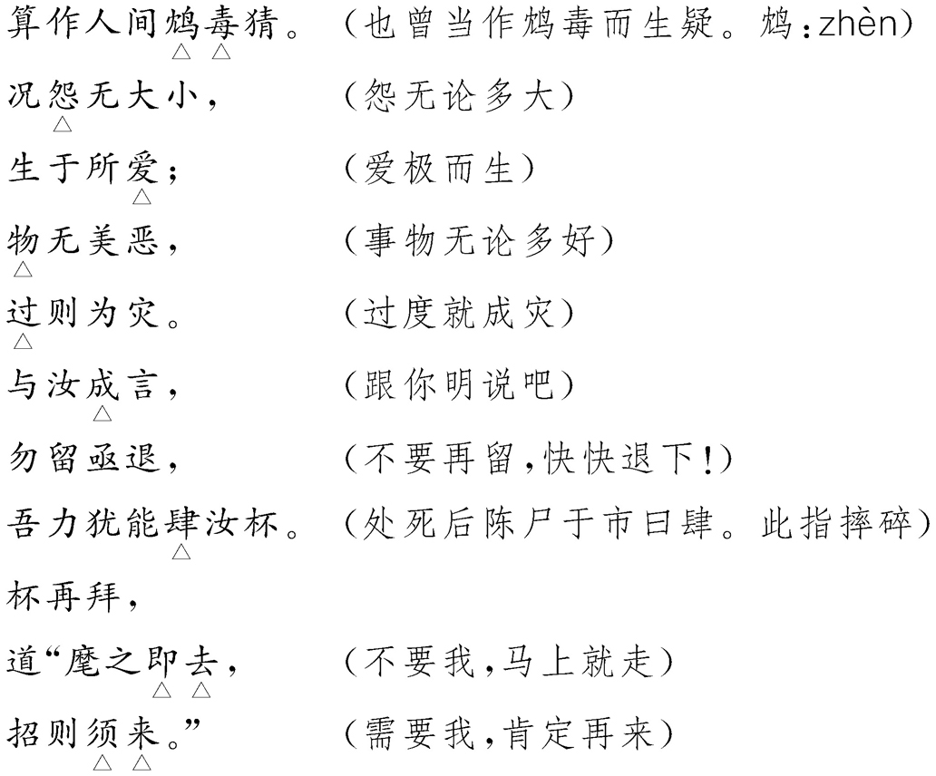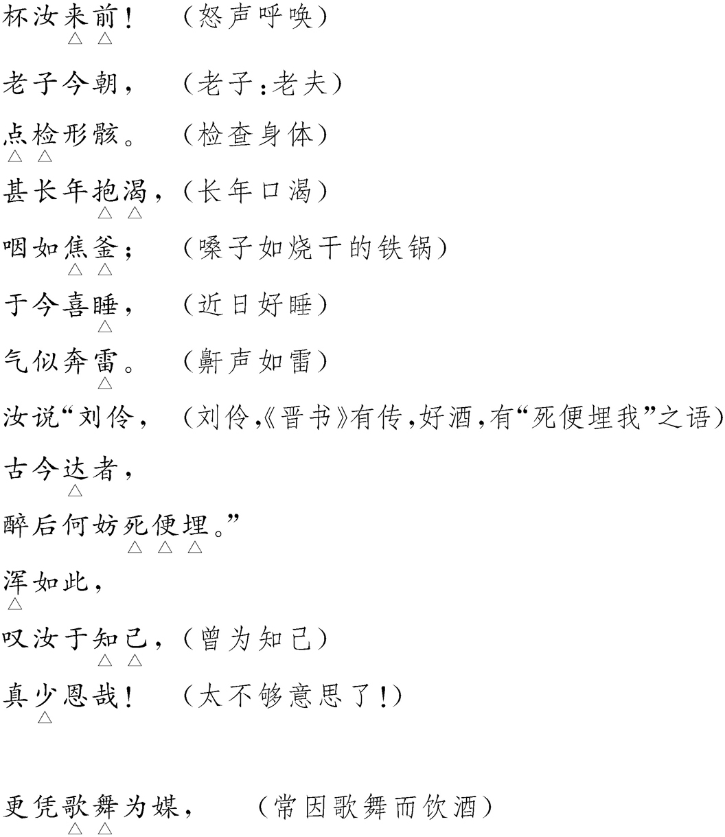 这首词是作者采取拟人化手法,塑造了“杯”的喜剧形象。杯主人前后态度不一,前骄而后馁。这一切都是由于主人“借酒浇愁”,壮志未酬,政治失意,极度苦闷,牢骚满腹,而“借杯抒怀”。不得已而戒酒,无酒何以消愁,矛盾而自嘲。朗诵时应以喜中隐悲为主调,令人听之先喜后悲,不可以调侃口吻,作滑稽表演。