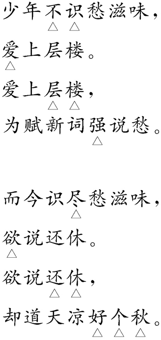作者被弹劾后,闲居常游博山道。心中郁闷,无意风光。此词以“愁”为核心,分“强说”和“欲说”两片,而其原因,在于“不识”在先,“识尽”在后。欲说而不说,“愁”甚重、甚多,却只说“天气”,苦之极也,“秋”,悲情所寄。朗诵时要注意凝重的心态,举重若轻的语气。