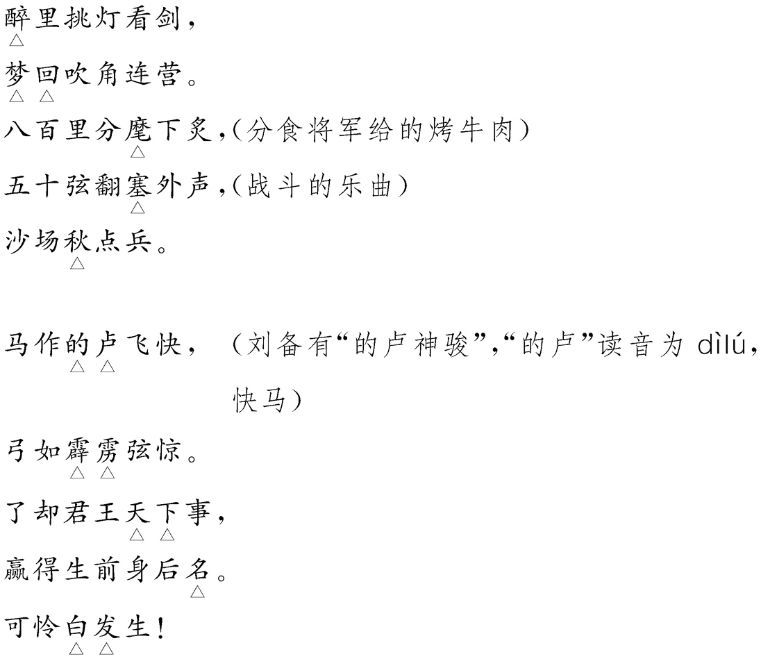 这首词是作者在陈同甫(即陈亮,人称龙川先生)访后所作。整首词均是醉梦中事,表现了抗敌的雄心壮志,最后一句陡然点明,白发已生而现实令人心冷。朗诵时先要渲染战场的壮烈场面,昂扬激越,最后一句,低沉而缓慢,余味无穷。