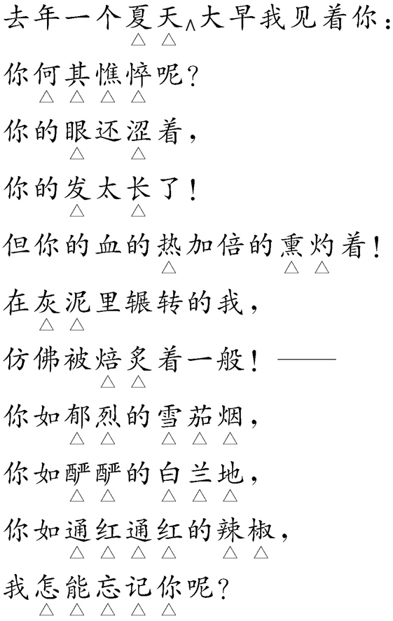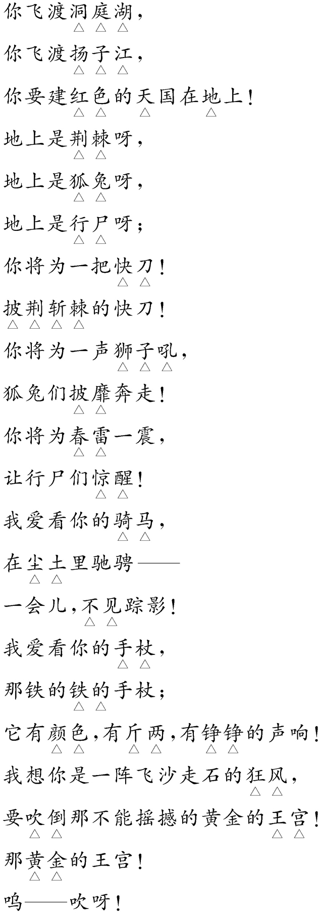 这首诗是作者赠给好友邓中夏的。邓中夏参加革命后改名为“安石”,英文缩写即“A.S.”。诗中热情奔放地赞美了共产党人,从理想到实践,从为人到献身,勾勒了一个革命者栩栩如生的鲜明的形象,如见其人,如闻其声。作者还抒发了对个人命运的感叹和对友人的深情思念。朗诵时应高昂、坚定地赞美,热诚、精心地表现,并体现出革命胜利后对先驱者的缅怀。