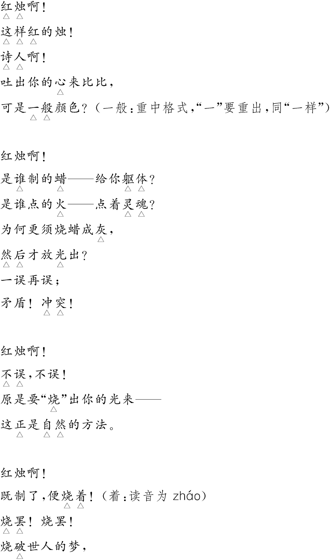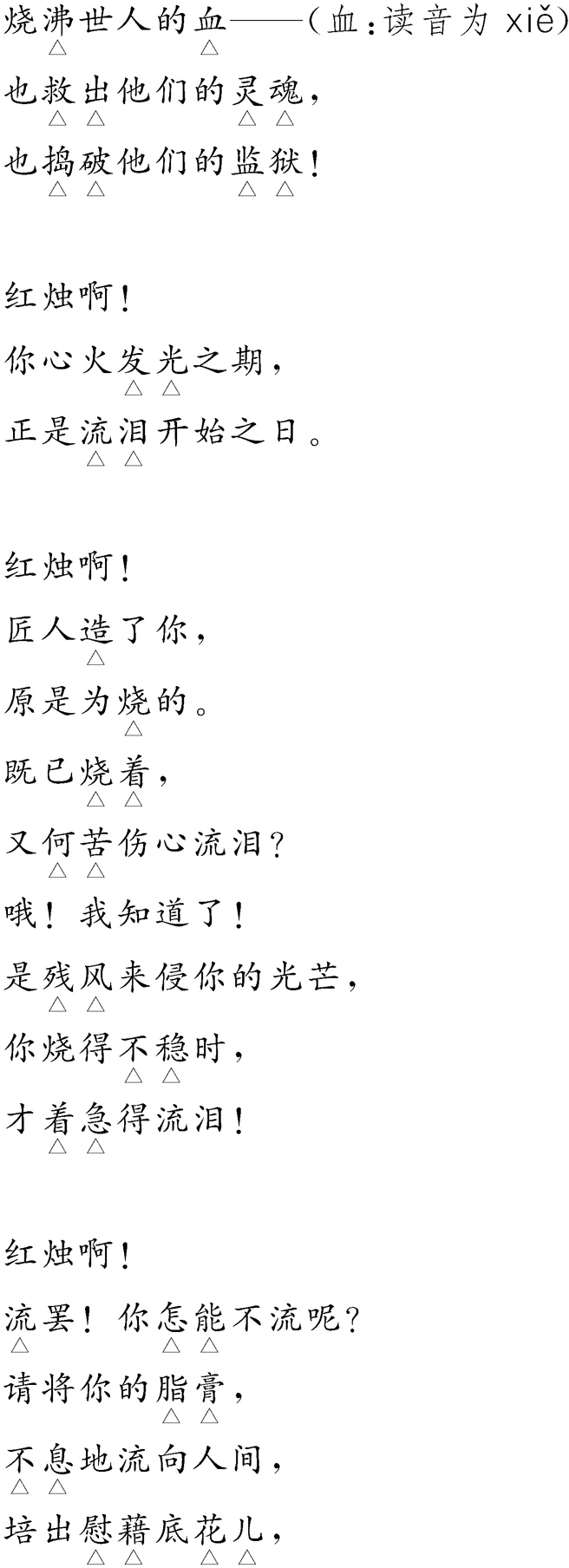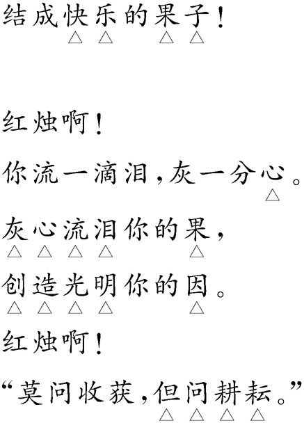 这首诗是作者表达自己献身决心的豪壮之音,自比蜡烛,发红光,流脂膏,培心花,结乐果,自己在奋斗中泪流干,身成灰,在所不惜,乐此不疲。最终,在乎的是奋斗的过程,而不在乎个人的收获。这是一种人生态度和人生况味,丝毫没有失望、落魄、悲凉、无助的哀伤。这种无私奉献的精神,是“五四”时期个性解放、追求科学和民主的主流意识形态,至今仍闪烁着灿烂的光辉,现在,尤其需要大力弘扬。朗诵时,应以豪情洋溢、信心百倍、无私无畏、为国为民的胸襟与气度,放声歌唱,热情赞颂!