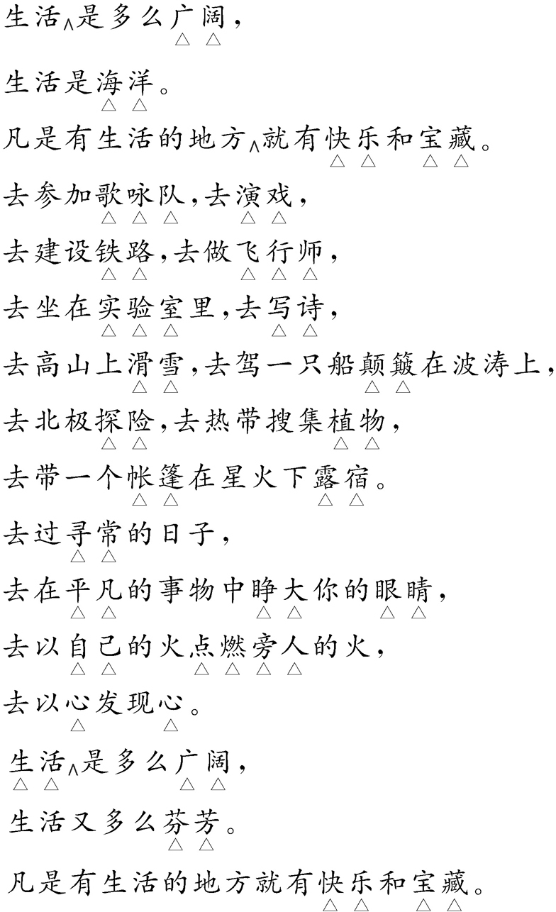 这首诗以15个排比句揭示了生活是海洋、生活又多么芬芳的真谛,真诚热烈,通俗高尚,是召唤,是现实,是鼓动,是直感。没有浅薄的娱乐,没有个人的寂寥,完全是发自肺腑的对生活的热爱,真切感受到的生活的美好。朗诵时,要在波澜起伏的诗意中,表现出追求理想、探寻宝藏的积极热烈,享受到生命的价值和人生的乐趣。