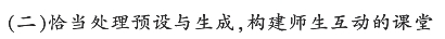 预设与生成是辩证的对立统一体。从教学方面讲,教学设计体现的是精心的预设,从目标的设定到课堂环节的设计,从课堂的导入到评价任务的制定,无不体现教师对课标和教材的研读、对学情的深入把握。但过分的预设,也会使课堂教学变得机械沉闷,缺乏生气和乐趣,使师生无法在课堂中焕发其生命活力。教学过程是师生交往、互动、共同发展的过程。课堂不是一个封闭系统,也不应拘泥于某些程式化的设计,我们的教学设计要吸纳意料之外的体验,鼓励即兴创造,超越预定的目标要求。