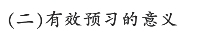 预习是学生对新课学习前独立地对新内容进行准备性的学习,是课堂教学的前奏和序曲。通俗地讲,“预习”就是在上课以前把要学的知识先学一遍,达到对知识有个大致的了解,以便在正式的学习过程中能够心中有数,有的放矢,在学习中掌握主动。而“有效性”是指完成计划的活动和达成目标结果的程度。