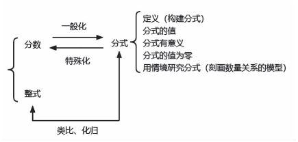 从运动的观点看,分式以统一的形式可以代表着任意一个具体分数,即分式是一般化了的分数。从分数到分式实质是“具体与抽象,特殊与一般”的辩证关系,因此可以从分式到分数的特殊化过程引入分式的求值,分式的意义,分式的值为零的讨论。