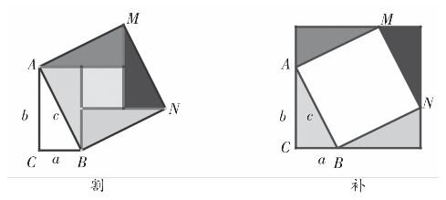 此题用“割”的方法——将斜边上的正方形分割为边长为整数的直角三角形可能有部分学生会遇到困难,教学中可以采取小组合作、互相交流的方式帮助学生找到解决方法。同时,对比分析“割”与“补”的思路方法的优劣。